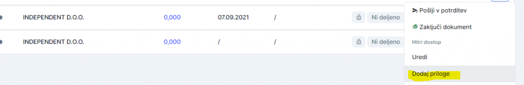Pri kopiranju iz programa Fakturiranje se samodejno ustvari priloga PDF računa (predloga izpisa Fakturiranje) in XML dokument. Po potrebi priložite dodatne priloge na način, da pritisnete na tri pikice in Dodaj priloge: