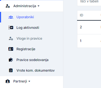 - Pravice sodelovanja: urejanje pravic sodelovanja partnerja