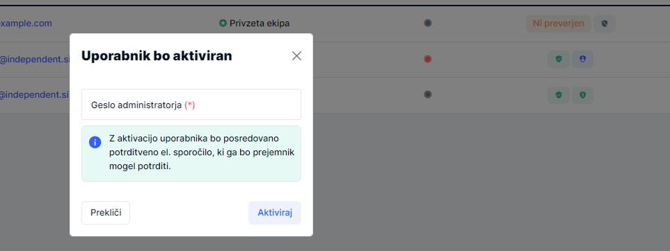Kot je bilo že prej omenjeno, je primarna vloga super administratorja potrjevanje kritičnih akcij. Spodaj je prikazan primer aktivacije uporabnika, ki jo izvedemo z vpisom administracijskega gesla trenutnega uporabnika.