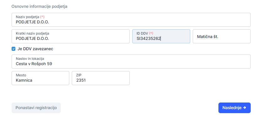 B, v drugem koraku vpišete osnovne podatke vašega podjetja: