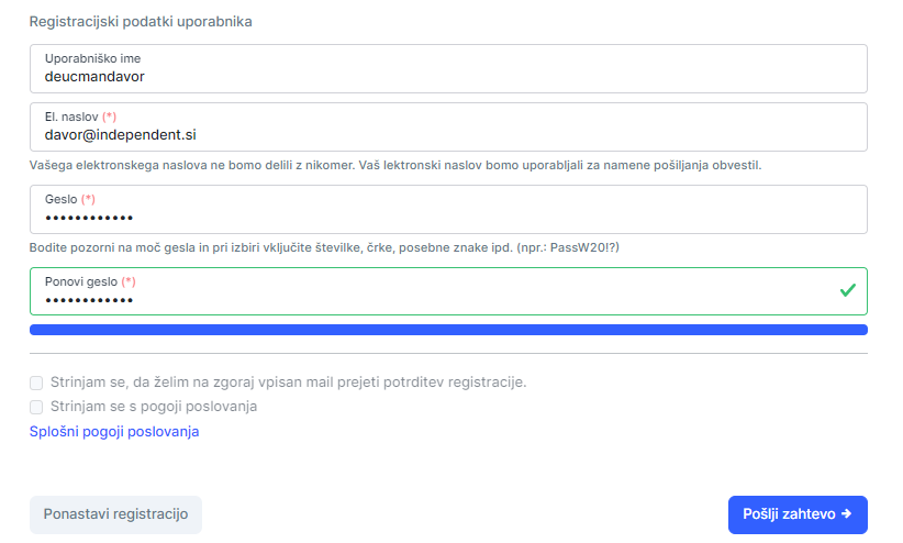 C, v tretjem koraku vpišete podatke za prijavo v portal, se strinjate s splošnimi pogoji poslovanja ter pošljete zahtevo za registracijo: