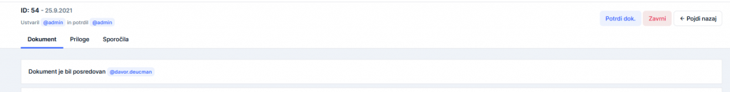 V dokumentu (do dokumenta dostopate iz obvestil oz. iz prejete e-pošte ali na pregledu dokumentov desni gumb Uredi), desno zgoraj lahko potrdite oz. zavrnete dokument:
