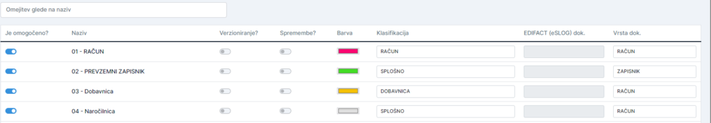 V tej sekciji je mogoče spreminjati pravice dostopa do tipov dokumentov. Prav tako je mogoče nastaviti barve (s pritiskom na barvo) vrst dokumentov: